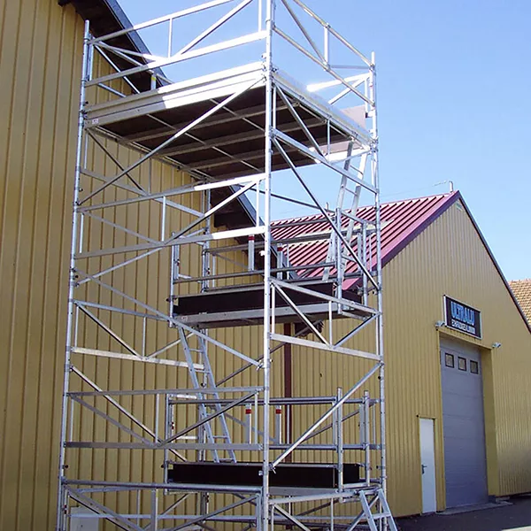 Tour aluminium avec escalier d’accès et roues Ø 200 mm renforcées à blocage.
